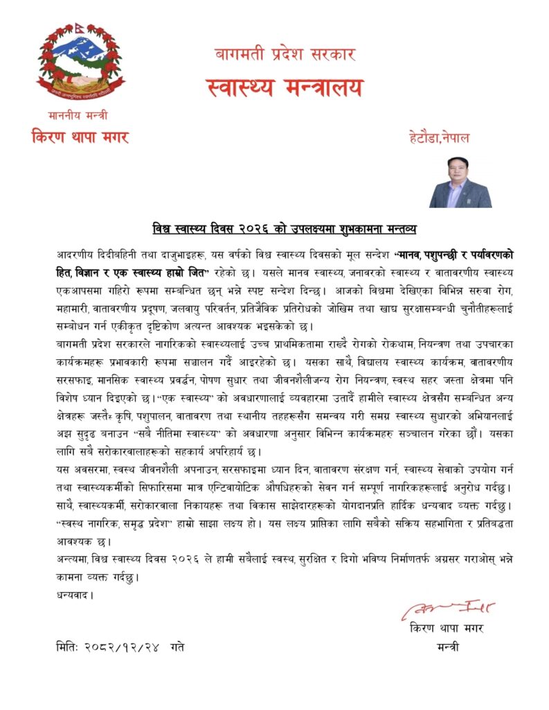 विश्व स्वास्थ्य दिवस २०२६ को अवसरमा बागमती प्रदेश सरकारका स्वास्थ्य मन्त्री किरण थापा मगरले सम्पूर्ण नागरिकमा शुभकामना व्यक्त गर्दै मानव, पशुपन्छी र पर्यावरणीय स्वास्थ्यबिचको अन्तरसम्बन्धलाई केन्द्रमा राखेर ‘एक स्वास्थ्य’ अवधारणालाई व्यवहारमा उतार्नुपर्नेमा जोड दिनुभएको छ।